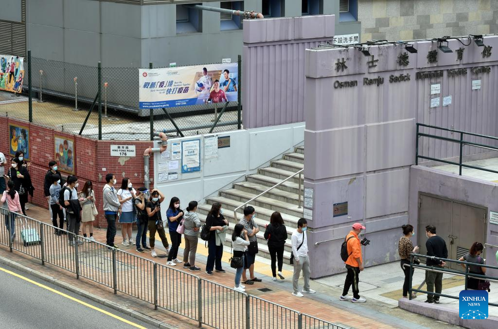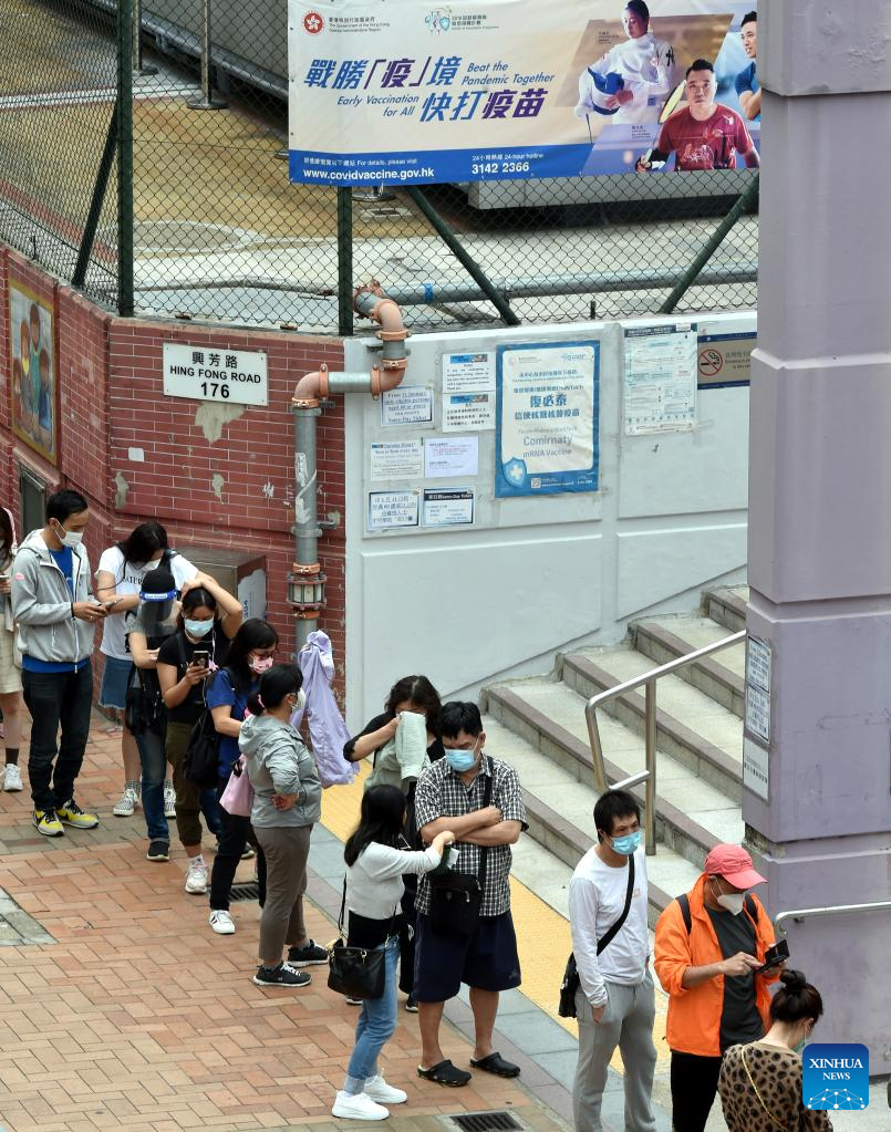 Citizens wearing face masks line up to receive COVID-19 vaccine in Hong Kong, south China, March 16, 2022. On Wednesday, Hong Kong registered 14,454 new COVID-19 cases by nucleic acid tests, and 14,818 additional positive cases through self-reported rapid antigen tests, official data showed. (Xinhua/Lo Ping Fai)