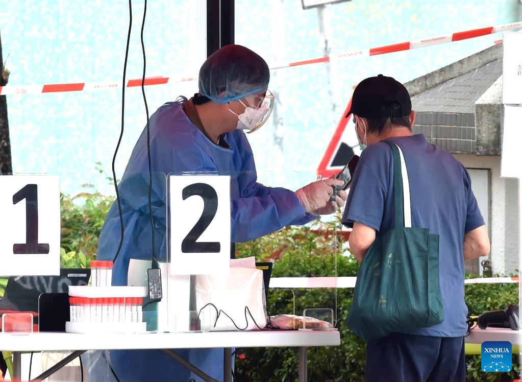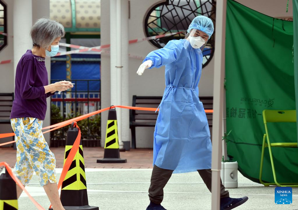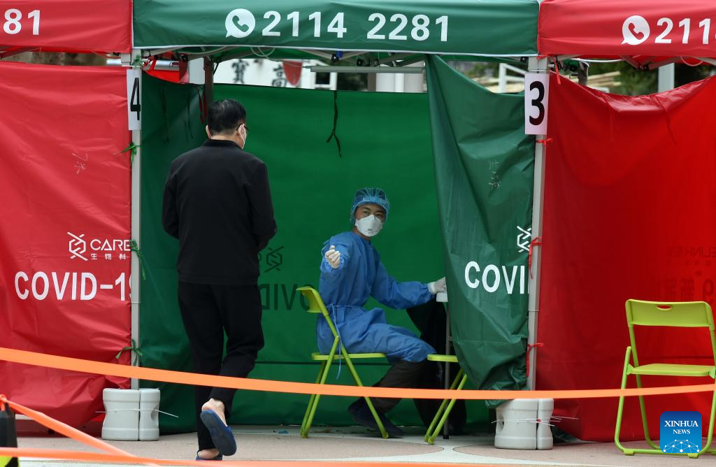 A medical worker guides a citizen at a mobile nucleic acid testing site in Hong Kong, south China, March 16, 2022. On Wednesday, Hong Kong registered 14,454 new COVID-19 cases by nucleic acid tests, and 14,818 additional positive cases through self-reported rapid antigen tests, official data showed. (Xinhua/Lo Ping Fai)