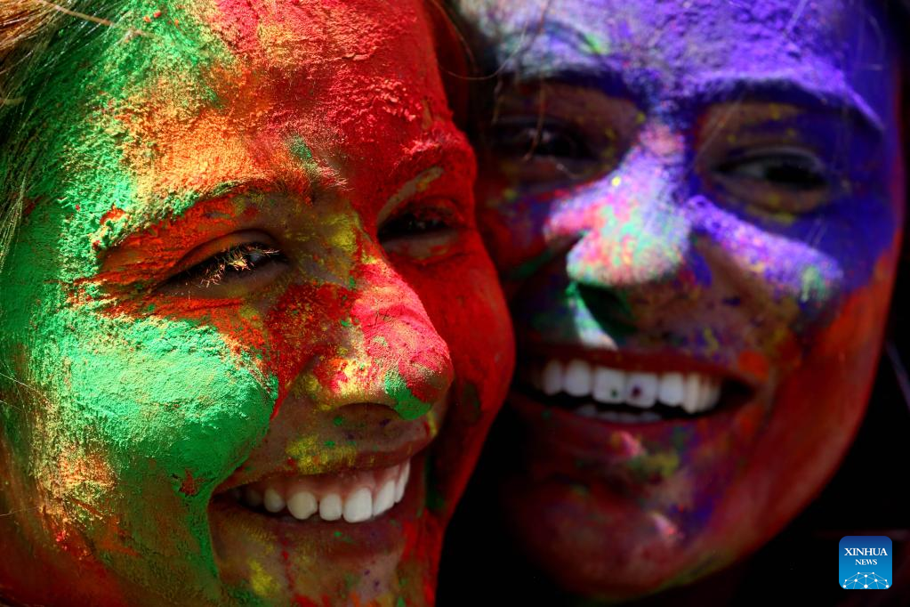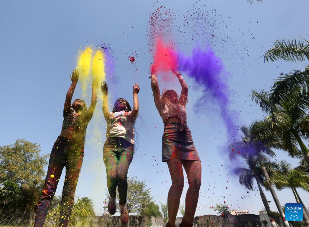College students celebrate Holi festival, the festival of colors, in Bhopal, capital of India's Madhya Pradesh state, March 16, 2022. (Str/Xinhua)
