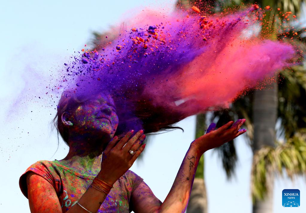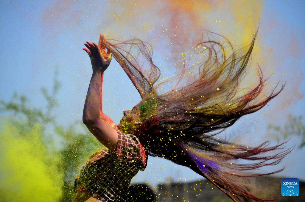 A college student celebrates Holi festival, the festival of colors, in Bhopal, capital of India's Madhya Pradesh state, March 16, 2022. (Str/Xinhua)