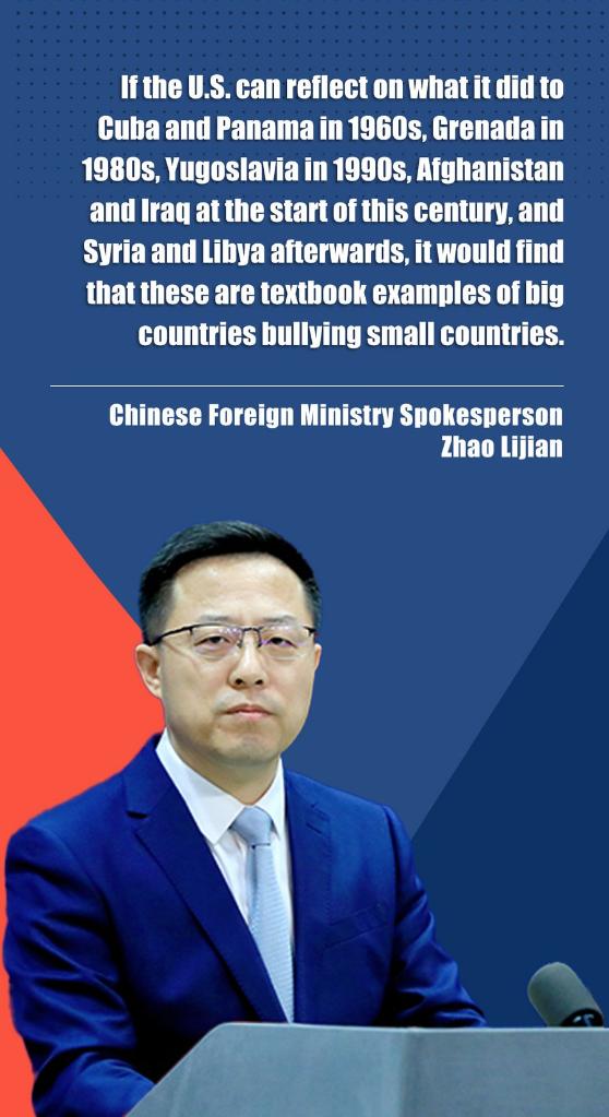 Zhao said that U.S. actions against Cuba, Panama, Grenada, Yugoslavia, Afghanistan, Iraq, Syria and Libya have been universally recognized as textbook examples of big countries bullying small countries.
