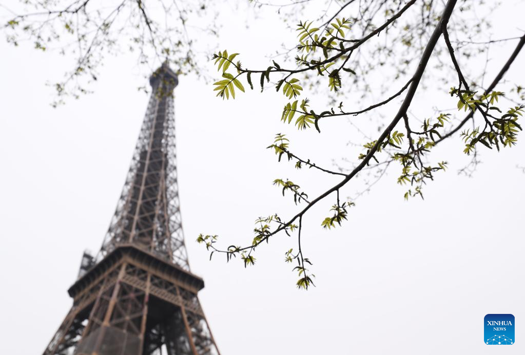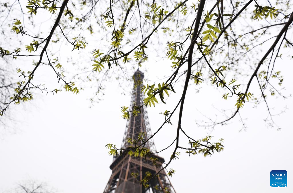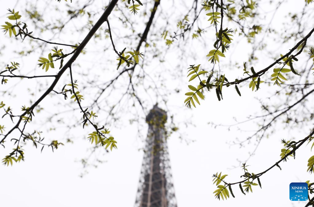Growing new leaves are seen at the Champ de Mars near the Eiffel Tower in Paris, France, March 16, 2022. (Xinhua/Gao Jing)