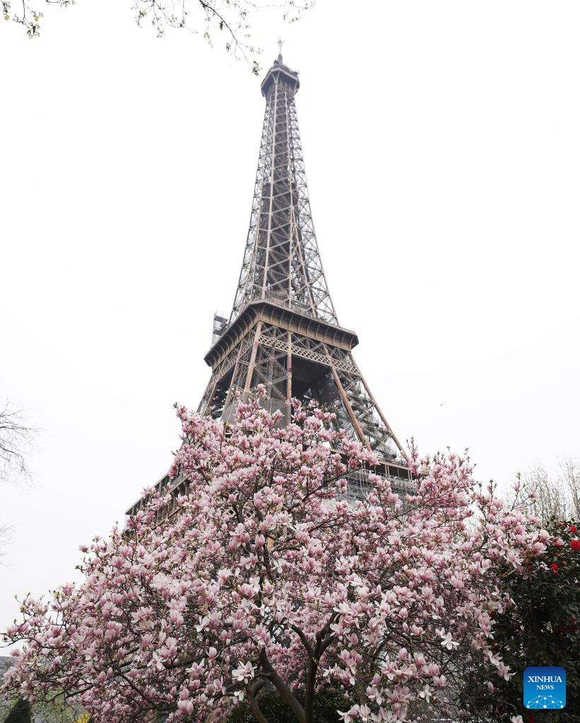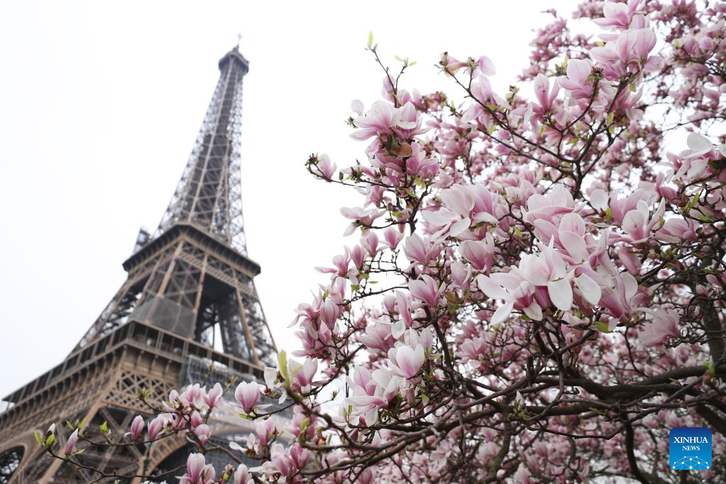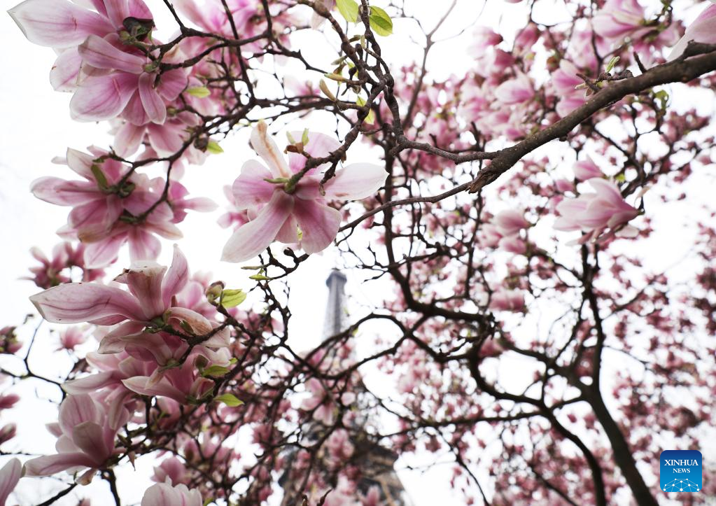 Magnolia blossoms are seen at the Champ de Mars near the Eiffel Tower in Paris, France, March 16, 2022. (Xinhua/Gao Jing)