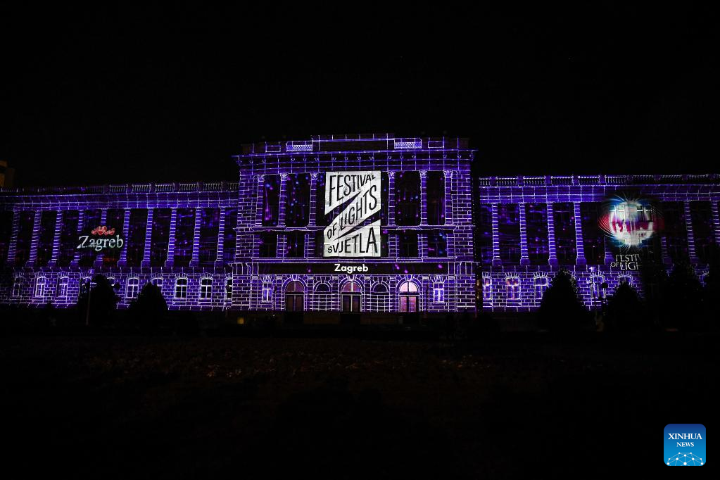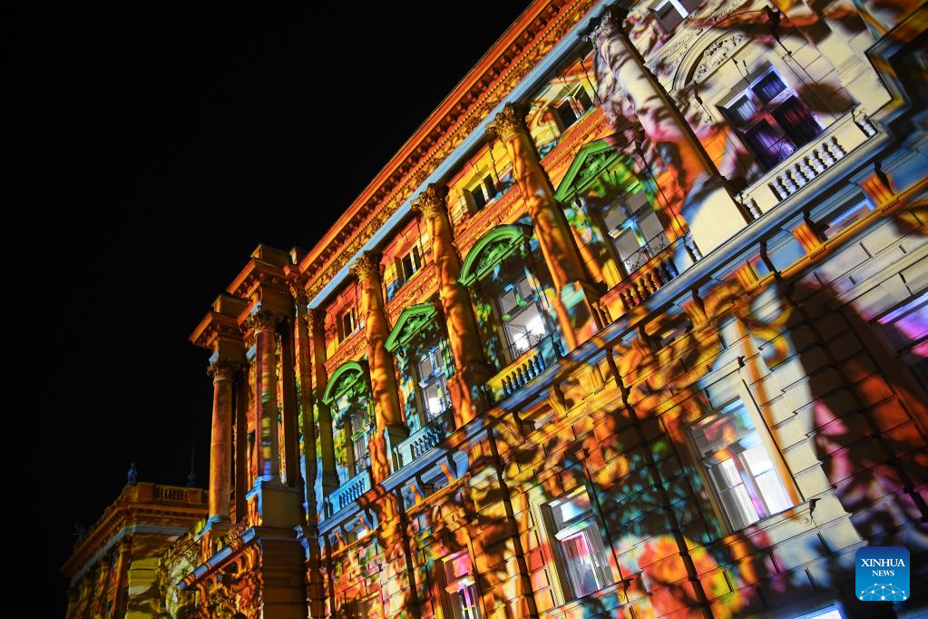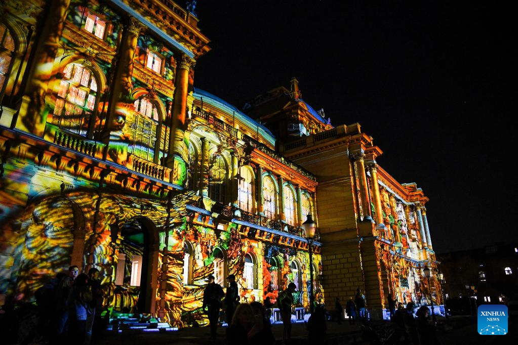 Photo taken on March 16, 2022 shows Croatian National Theatre illuminated during the Festival of Lights in Zagreb, Croatia. (Josip Regovic/PIXSELL via Xinhua)