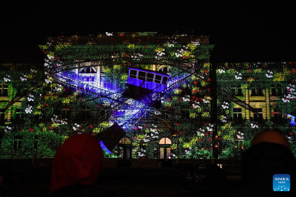 Photo taken on March 16, 2022 shows Mimara Museum illuminated during the Festival of Lights in Zagreb, Croatia. (Josip Regovic/PIXSELL via Xinhua)