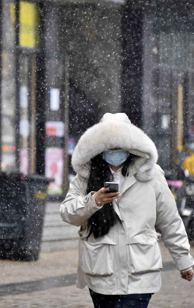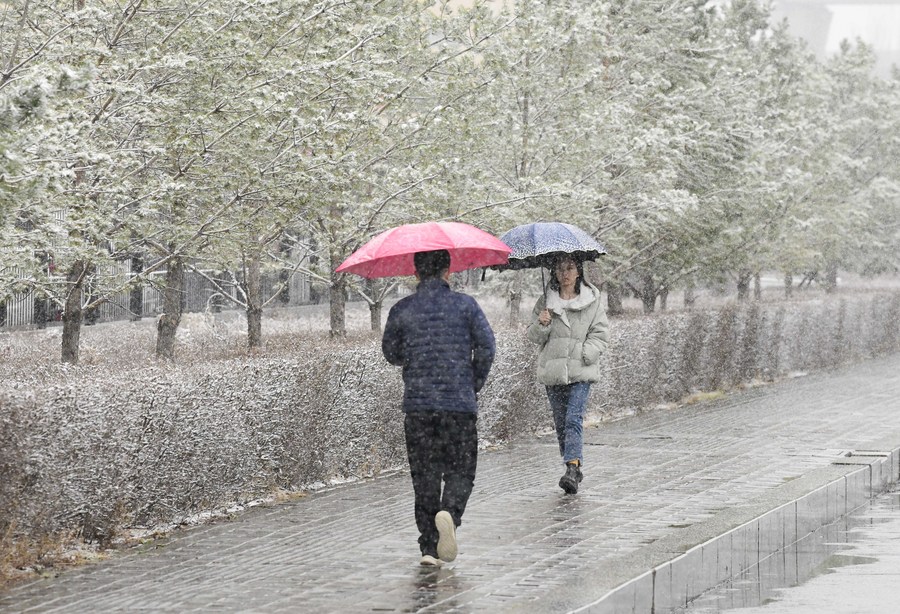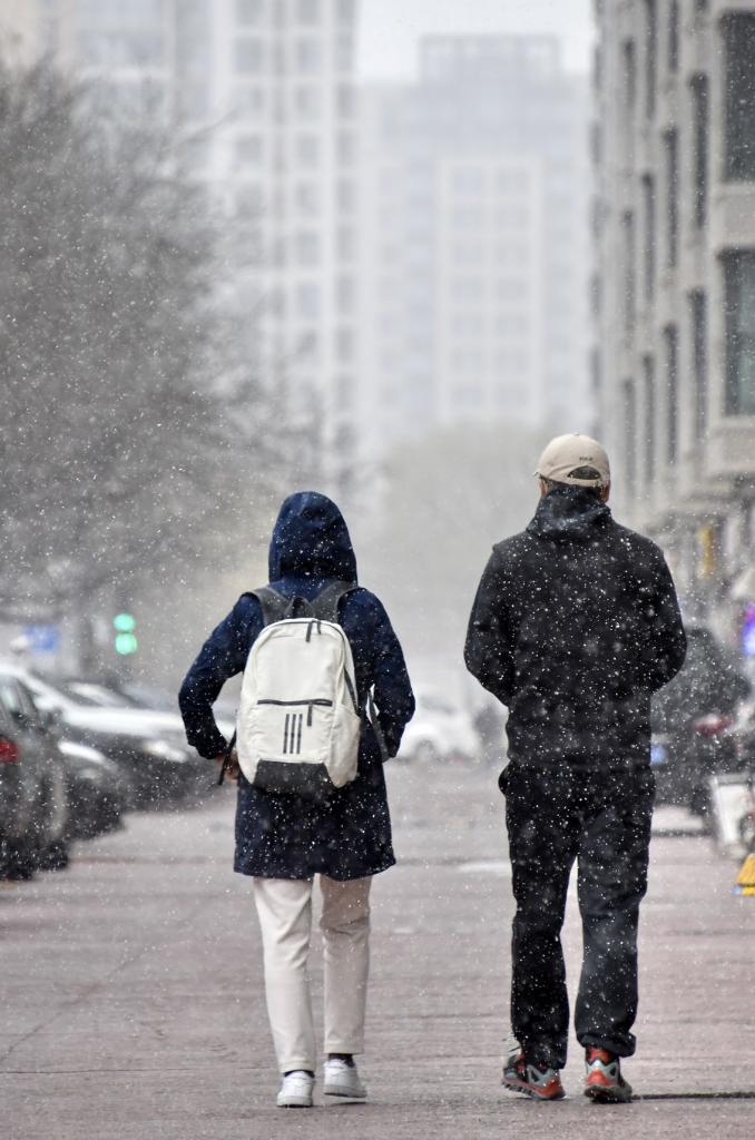 People walk in snow in Hohhot, north China's Inner Mongolia Autonomous Region, March 17, 2022. (Photo by Wang Zheng/Xinhua)