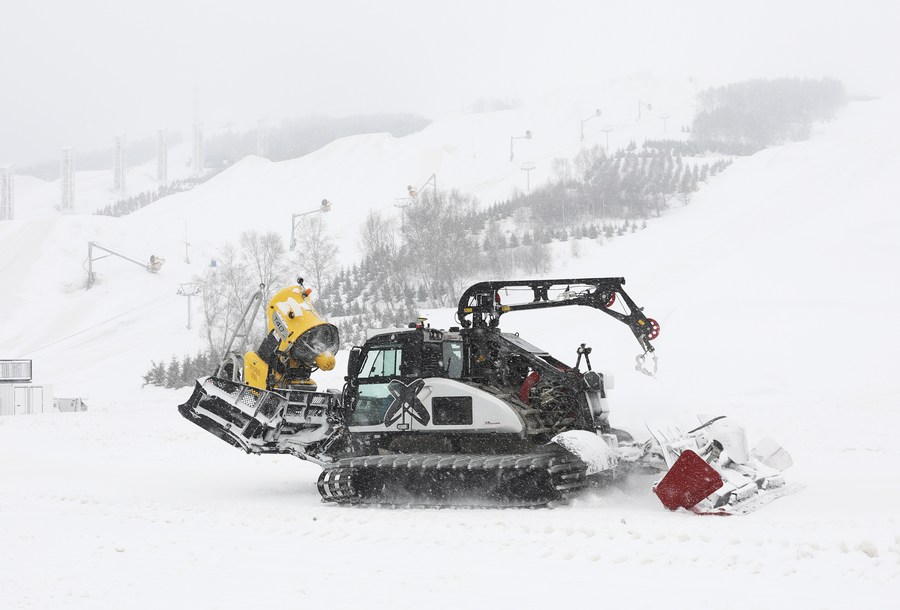 A snow pressing machine works at Genting Snow Park in Zhangjiakou, north China's Hebei Province, March 17, 2022. (Photo by Wu Diansen/Xinhua)