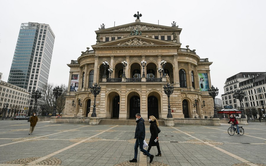 Pedestrians are seen in front of the Alte Oper in Frankfurt, Germany, Jan. 15, 2022. (Xinhua/Lu Yang)