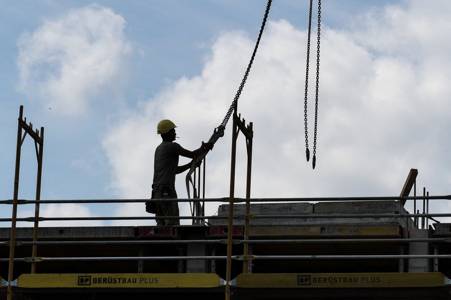 A laborer works at a construction site in Berlin, capital of Germany, on July 30, 2021. (Photo by Stefan Zeitz/Xinhua)