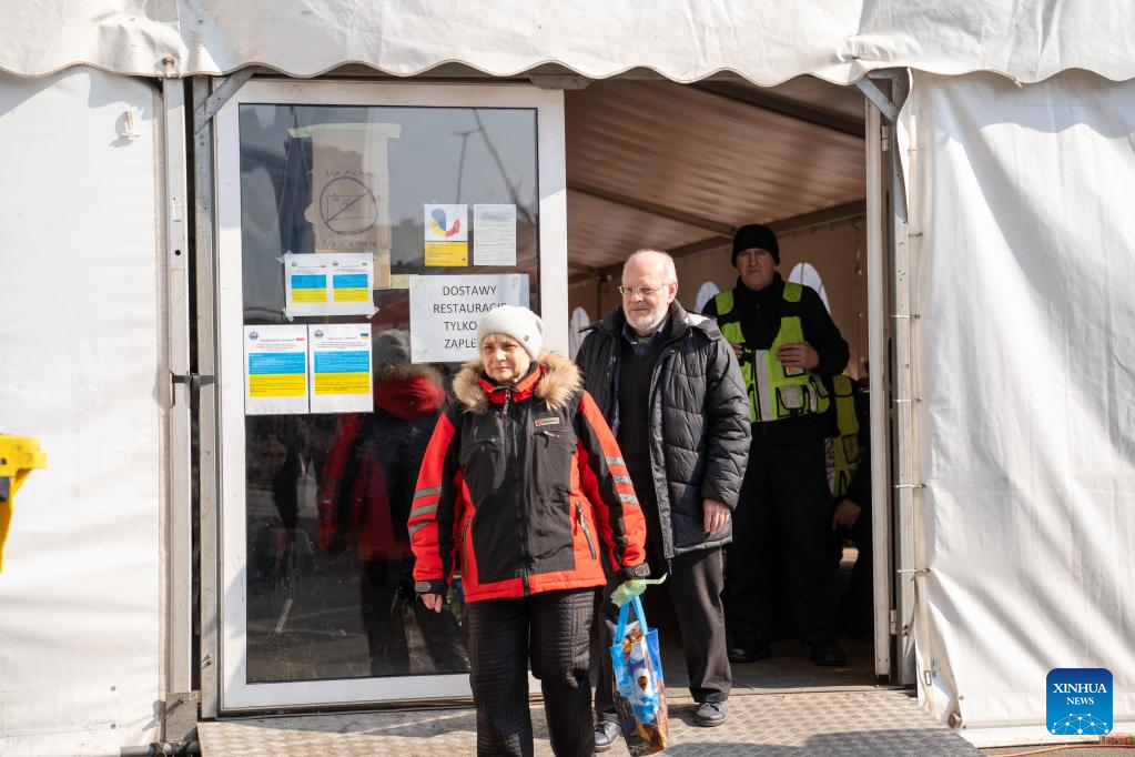 People walk out of a makeshift dining hall for the Ukrainians at Warsaw Central Railway Station in Warsaw, Poland, March 17, 2022. (Xinhua/Ren Ke)