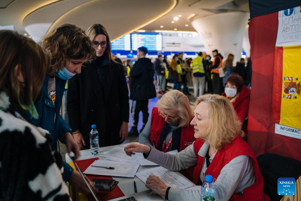 Volunteers register information for the Ukrainians at Warsaw Central Railway Station in Warsaw, Poland, March 17, 2022. (Xinhua/Ren Ke)