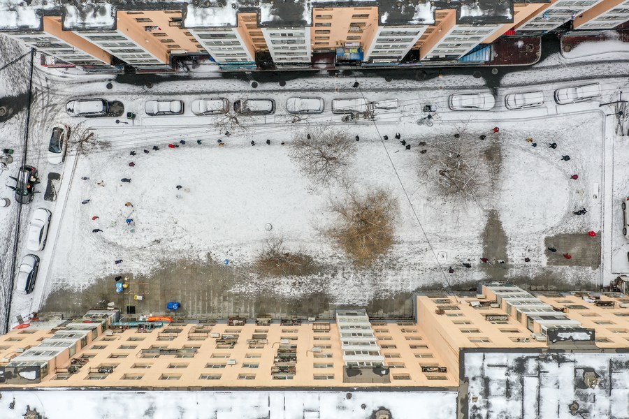 Aerial photo taken on March 15, 2022 shows people lining up for nucleic acid test in Jilin City, northeast China's Jilin Province, March 15, 2022. (Xinhua/Zhang Nan)