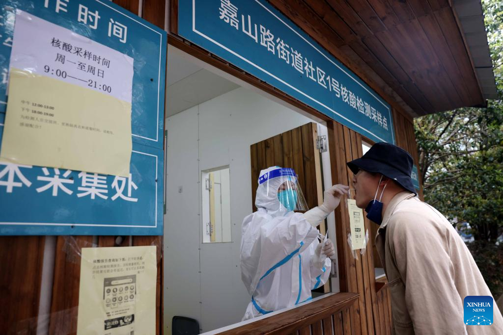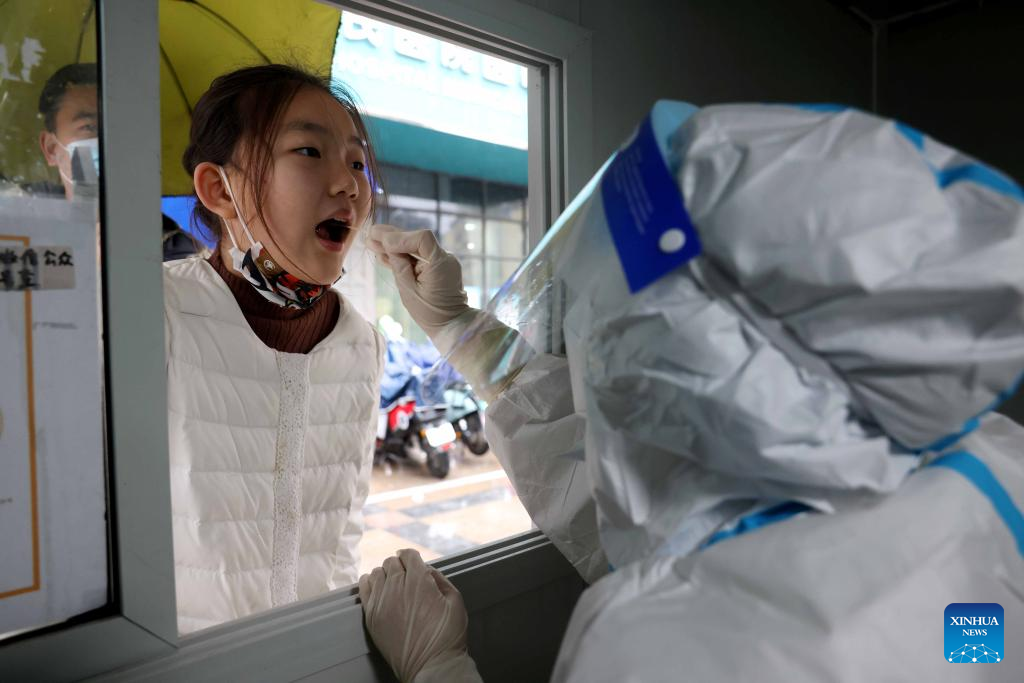A resident receives free nucleic acid test at a testing site in Yaohai District of Hefei, east China's Anhui Province, March 17, 2022. Yaohai District of Hefei has set up multiple testing sites for nucleic acid testing to help curb the spread of COVID-19. (Photo by Xie Chen/Xinhua)