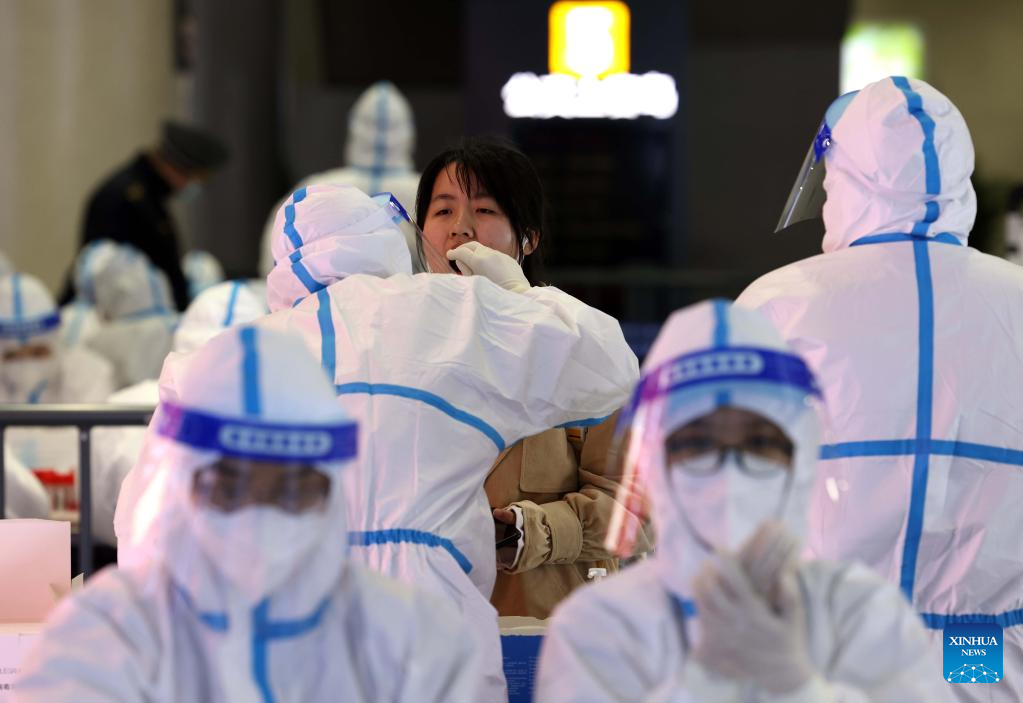 A passenger receives free nucleic acid test at Hefei Railway Station in Hefei, east China's Anhui Province, March 17, 2022. Yaohai District of Hefei has set up multiple testing sites for nucleic acid testing to help curb the spread of COVID-19. (Photo by Xie Chen/Xinhua)