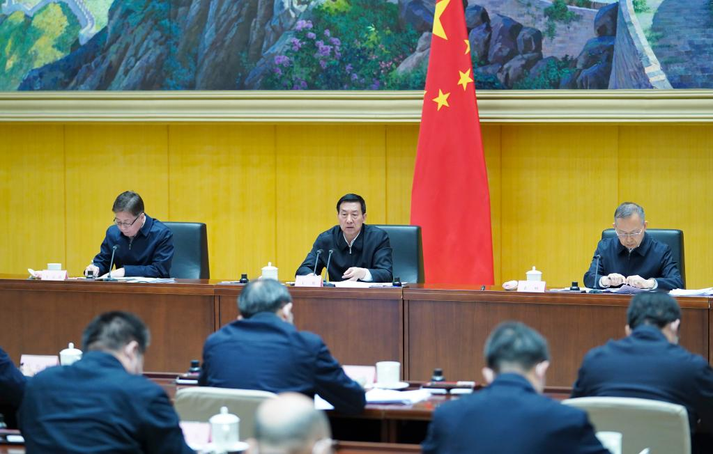 Chinese State Councilor Wang Yong, also head of the national headquarters of forest and grassland fire prevention and control, attends a national teleconference on forest and grassland fire prevention and control in Beijing, capital of China, March 17, 2022. (Xinhua/Yin Bogu)