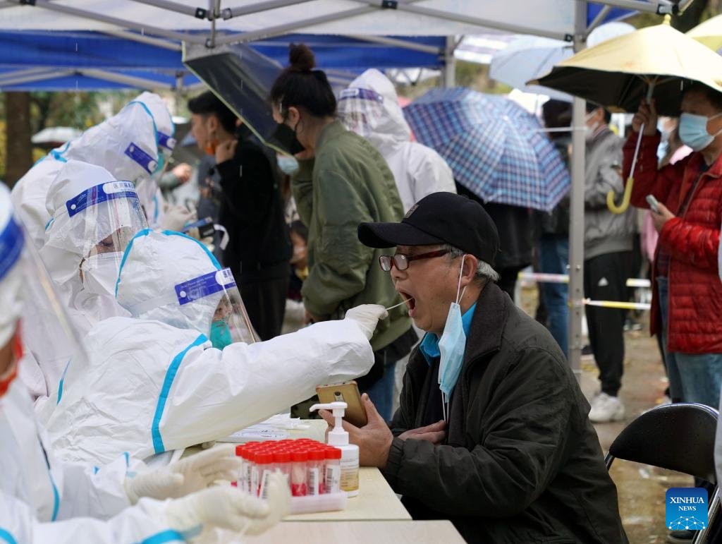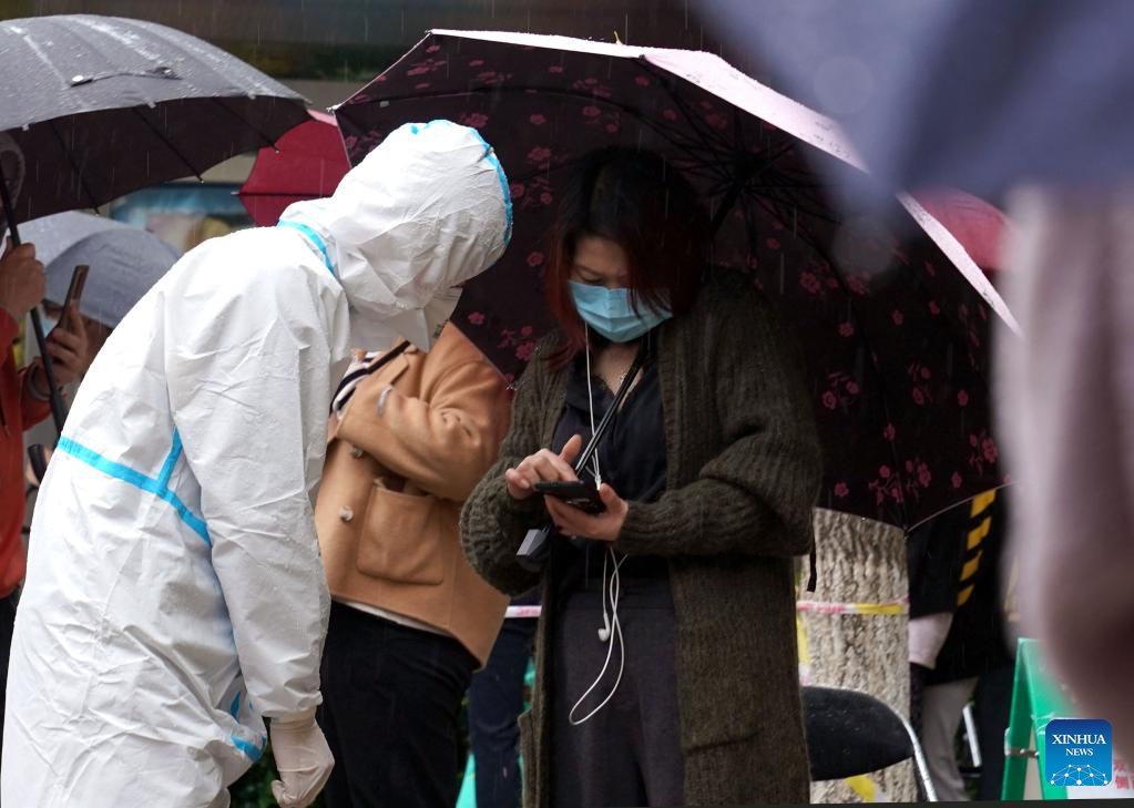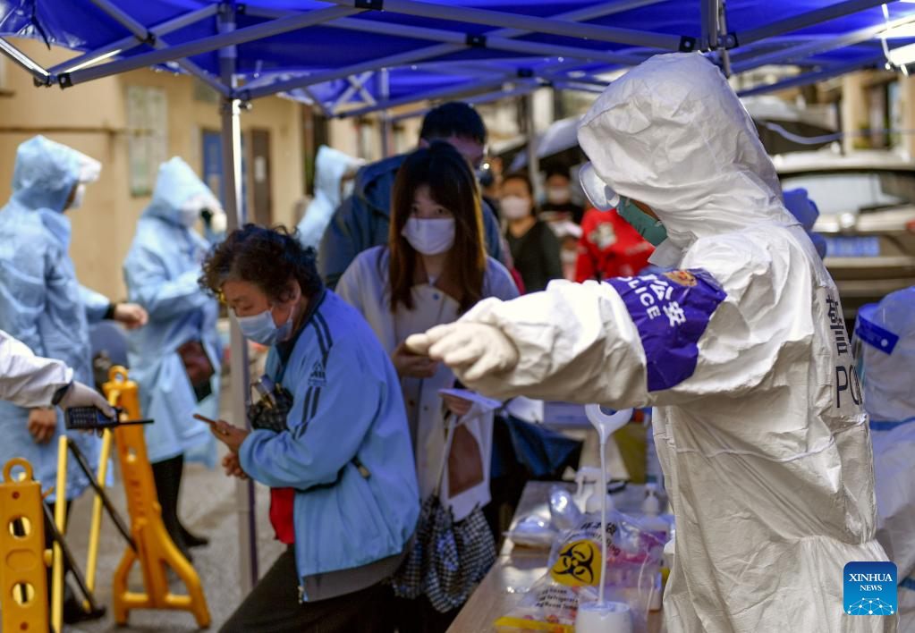 Citizens receive nucleic acid tests at a residential area in east China's Shanghai, March 17, 2022. (Xinhua/Liu Ying)