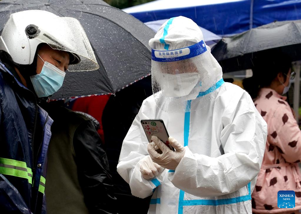 A medical worker guides citizens to receive nucleic acid tests at a residential area in east China's Shanghai, March 17, 2022. (Xinhua)