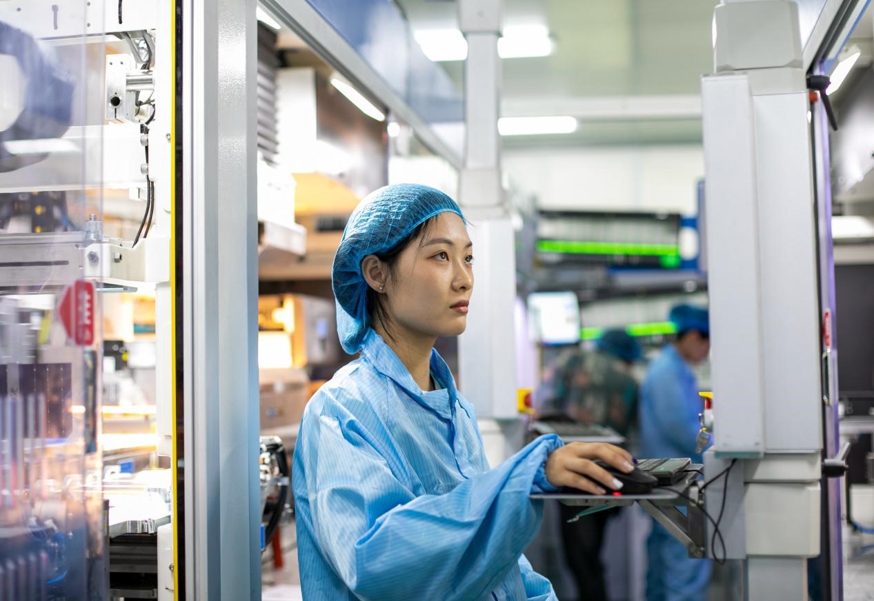 Workers are busy producing photovoltaic modules at a 5G-based smart factory of a new energy technology company in Hai’an city, east China’s Jiangsu province. (People’s Daily Online/Zhai Huiyong)