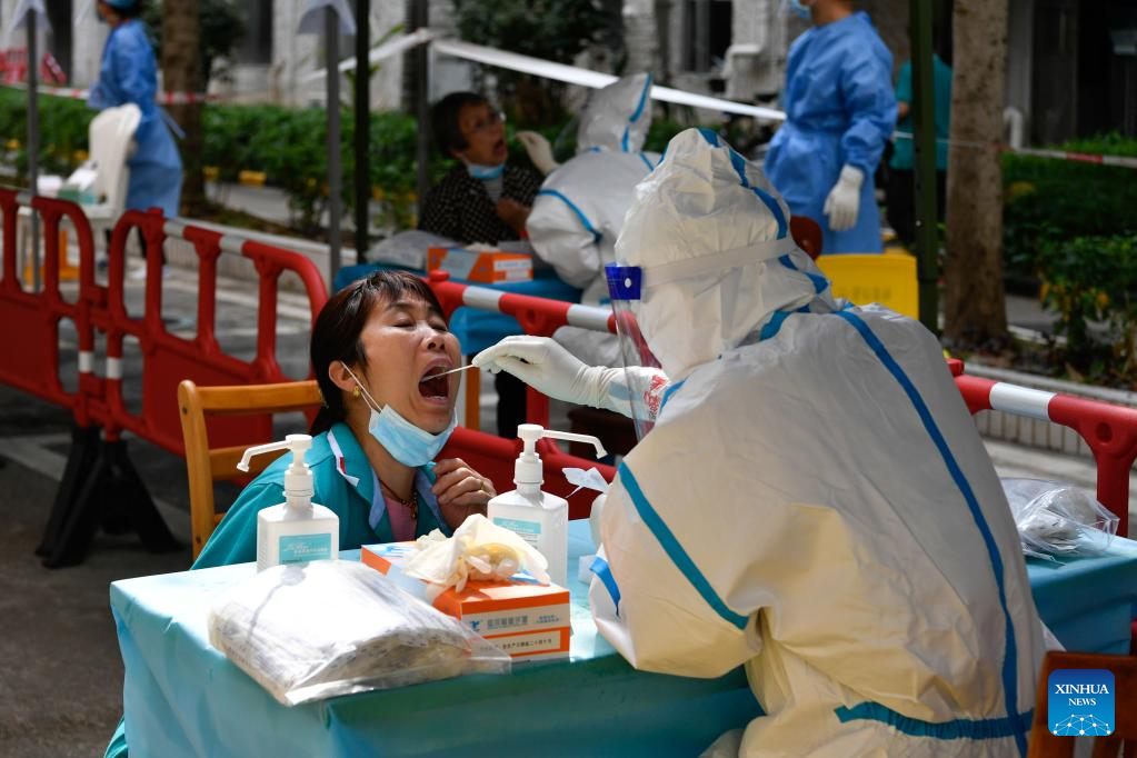 A resident receives nucleic acid test in Futian District of Shenzhen, south China's Guangdong Province, March 17, 2022. Shenzhen, China's major tech hub bordering the country's Hong Kong Special Administrative Region, asked its 17-million-plus residents on Monday to work from home if they can, while the city is carrying out three rounds of mass testing.