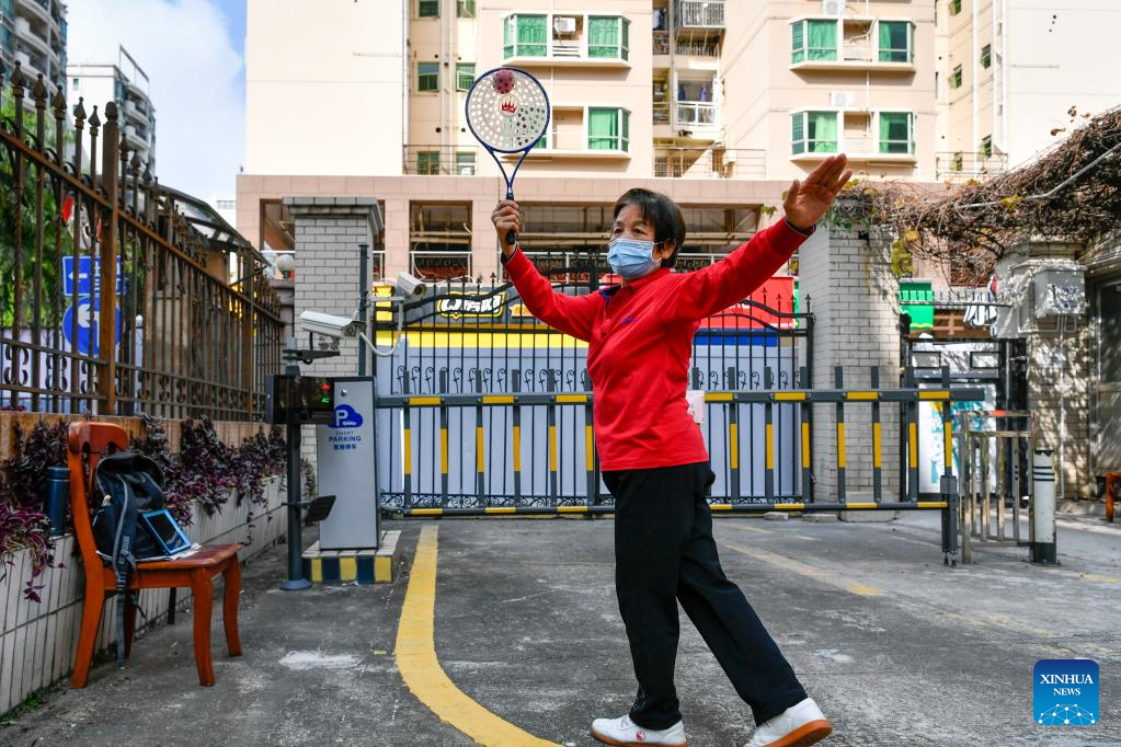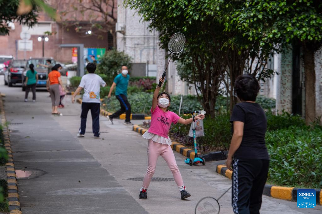 Residents exercise in a residential area in Futian District of Shenzhen, south China's Guangdong Province, March 16, 2022. Shenzhen, China's major tech hub bordering the country's Hong Kong Special Administrative Region, asked its 17-million-plus residents on Monday to work from home if they can, while the city is carrying out three rounds of mass testing.