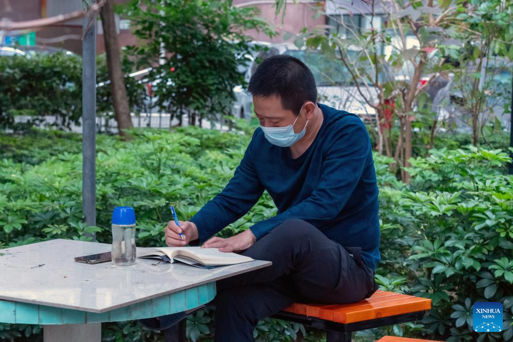 A resident reads a book in a residential area in Futian District of Shenzhen, south China's Guangdong Province, March 16, 2022. Shenzhen, China's major tech hub bordering the country's Hong Kong Special Administrative Region, asked its 17-million-plus residents on Monday to work from home if they can, while the city is carrying out three rounds of mass testing.