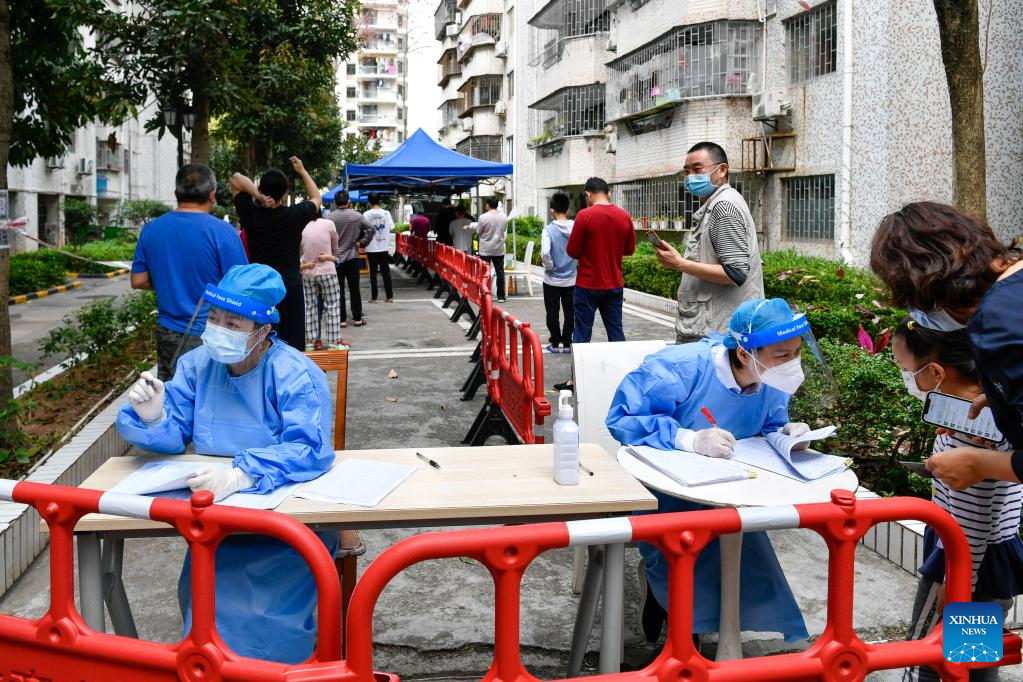 A staff member checks information of residents for nucleic acid test in Futian District of Shenzhen, south China's Guangdong Province, March 16, 2022. Shenzhen, China's major tech hub bordering the country's Hong Kong Special Administrative Region, asked its 17-million-plus residents on Monday to work from home if they can, while the city is carrying out three rounds of mass testing.