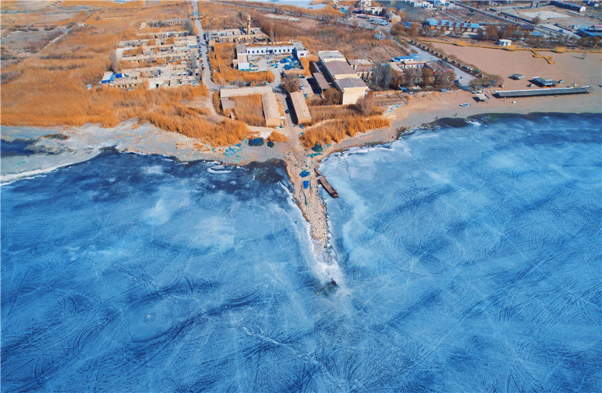 Frozen during winter, the Bosten Lake in northwest China's Xinjiang Uygur Autonomous Region starts thawing as temperatures rise, leaving cracks on its icy surface. (Photo/Ayabatu)