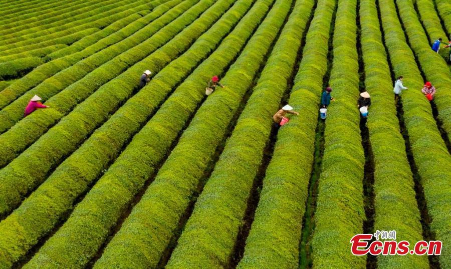 Villagers harvest spring tea leaves at a tea plantation in Xinyu city, east China's Jiangxi Province, March 18, 2022. Over 66 hectares of spring tea begin harvest in Jiangxi. (Photo: China News Service/Zhao Chunliang)