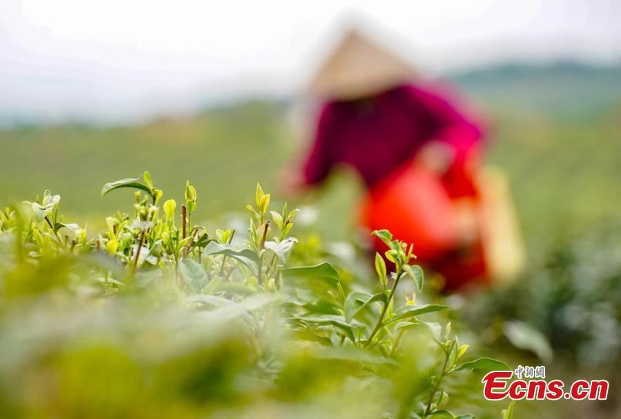 A villager harvests spring tea leaves at a tea plantation in Xinyu city, east China's Jiangxi Province, March 18, 2022. Over 66 hectares of spring tea begin harvest in Jiangxi. (Photo: China News Service/Zhao Chunliang)