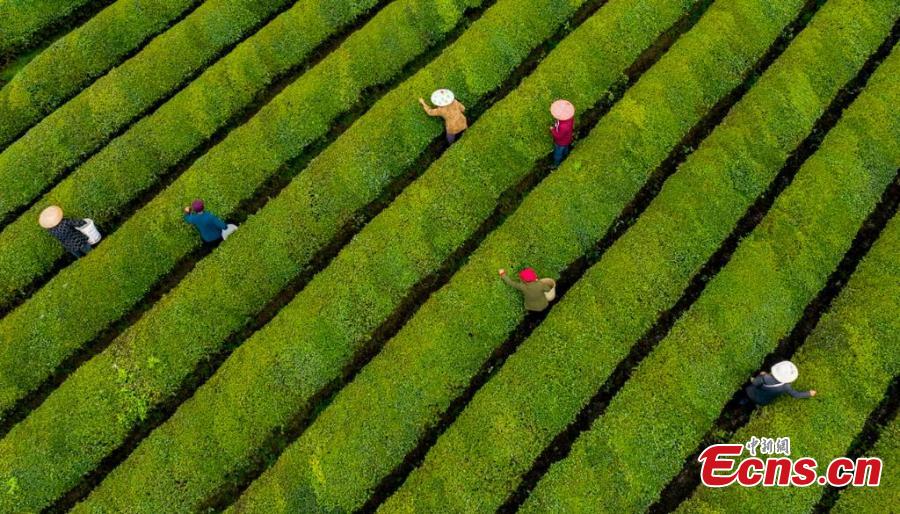 Villagers harvest spring tea leaves at a tea plantation in Xinyu city, east China's Jiangxi Province, March 18, 2022. Over 66 hectares of spring tea begin harvest in Jiangxi. (Photo: China News Service/Zhao Chunliang)