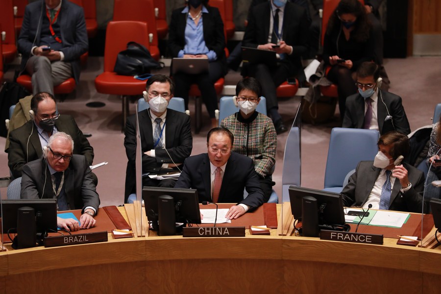Zhang Jun (C, front), China's permanent representative to the United Nations, speaks during a Security Council meeting on the Ukraine refugee issue at the UN headquarters in New York, on March 17, 2022. (Xinhua/Xie E)