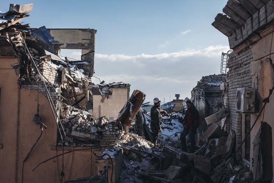 Firefighters work near a building in Kharkiv, Ukraine, March 13, 2022. (Photo by Diego Herrera/Xinhua)