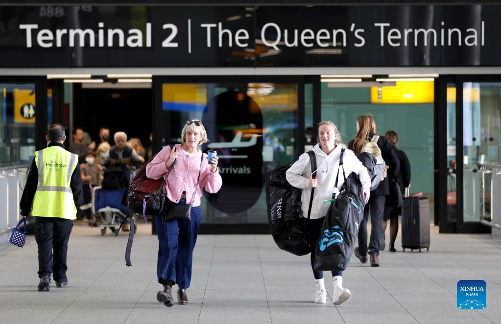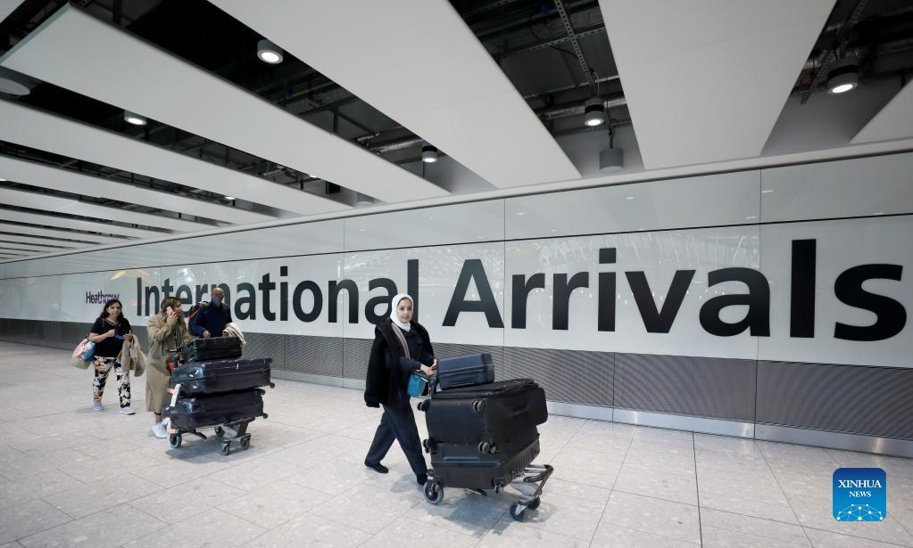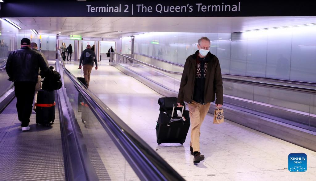 Passengers walk in Heathrow Airport in London, Britain, March 18, 2022. The British government removed all remaining COVID restrictions on international travel for all passengers from 4 a.m. local time on Friday. (Xinhua/Li Ying)