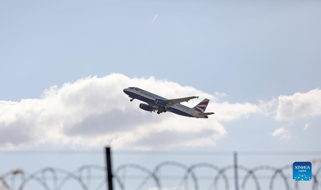 An airplane takes off in Heathrow Airport in London, Britain, March 18, 2022. The British government removed all remaining COVID restrictions on international travel for all passengers from 4 a.m. local time on Friday. (Xinhua/Li Ying)