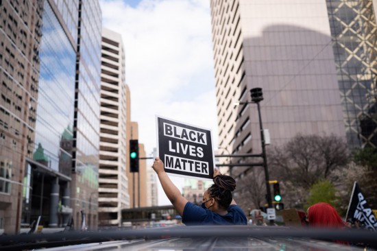 A woman holds a sign outside the Hennepin County Government Center reacting to the trial verdict that former Minneapolis police officer Derek Chauvin was found guilty on all counts in Minneapolis, Minnesota, April 20, 2021. Former Minneapolis police officer Derek Chauvin was found guilty of two counts of murder and one count of manslaughter over the death of Black man George Floyd, the judge presiding over the high-profile trial announced Tuesday, reading the jury's verdict. (Photo by Ben Brewer/Xinhua)