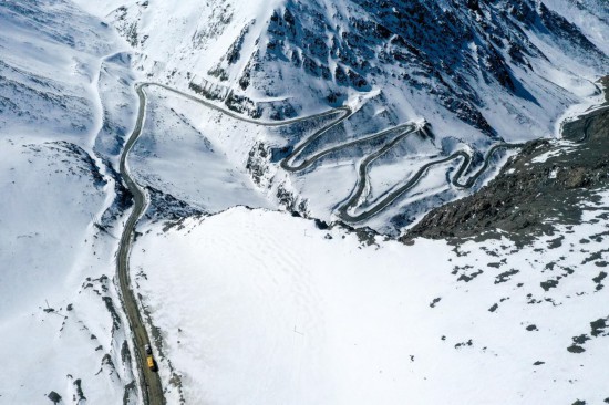 Aerial photo shows a school bus running on the mountain road in northwest China's Xinjiang Uygur Autonomous Region, on Feb. 25, 2022. (Xinhua/Ding Lei)