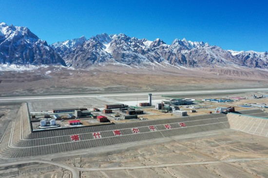 Aerial photo shows the Taxkorgan Airport under construction in northwest China's Xinjiang Uygur Autonomous Region on Feb. 27, 2022. (Xinhua/Ding Lei)