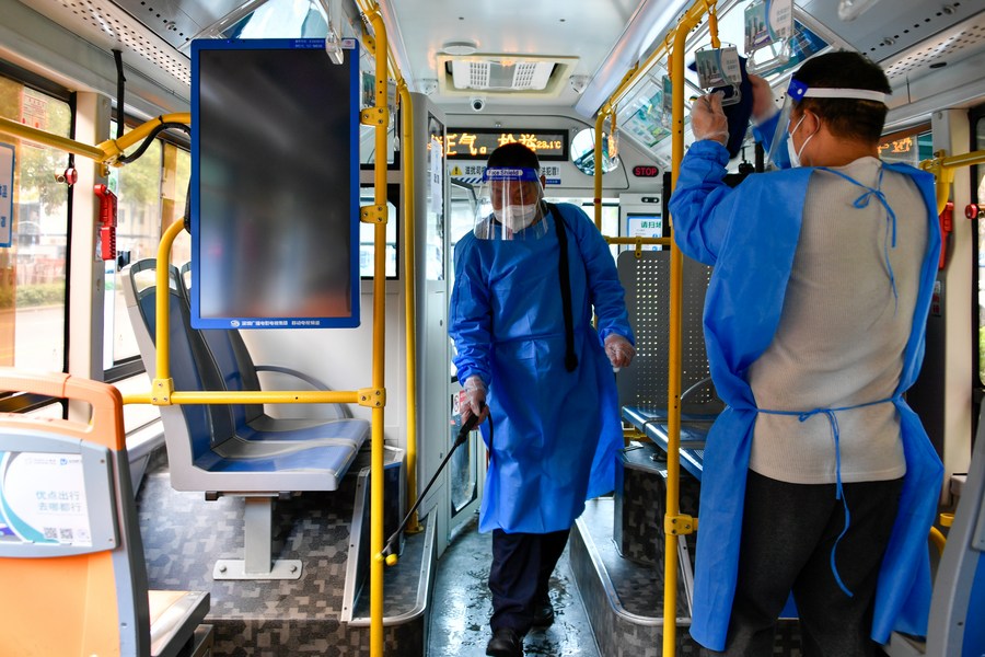 A staff member sprays disinfectant inside a bus in Futian District of Shenzhen, south China's Guangdong Province, March 13, 2022. (Photo by Chu Yan/Xinhua)