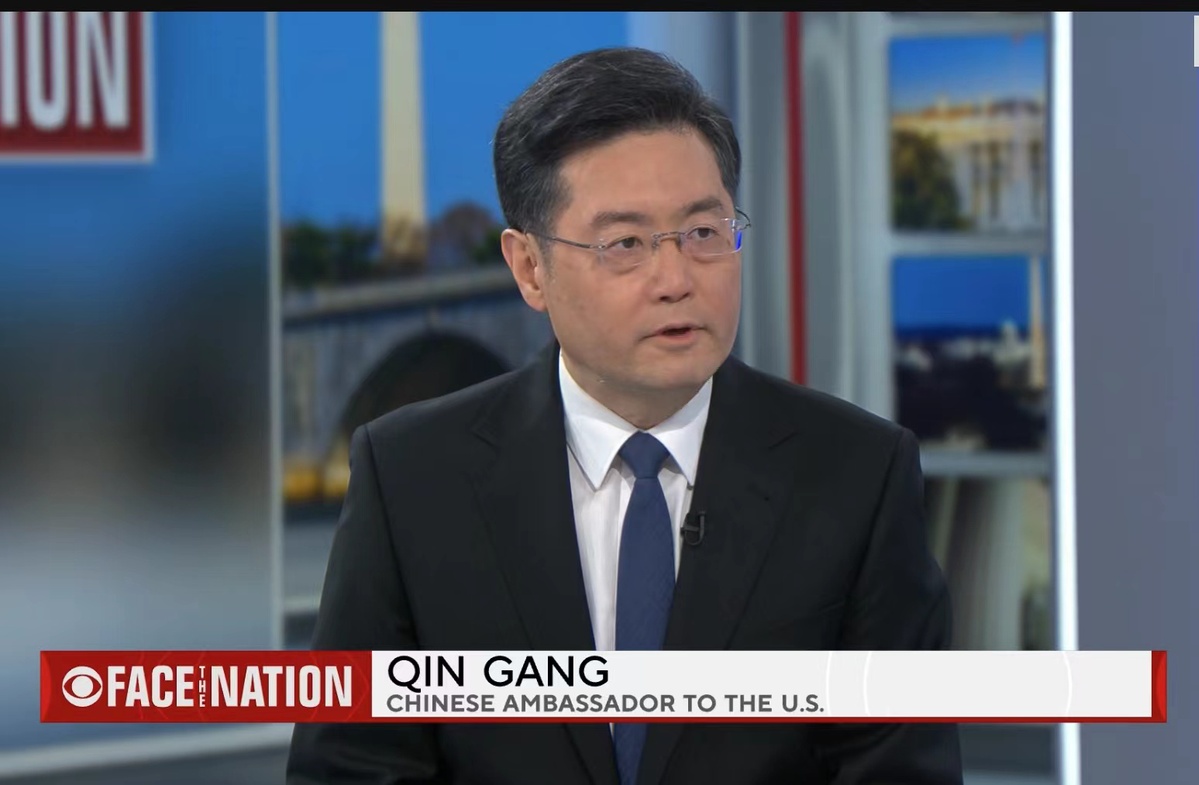 Qin Gang, China's ambassador to the United States, is seen on the CBS News show Face the Nation on March 20, 2021. [Photo provided to chinadaily.com.cn]