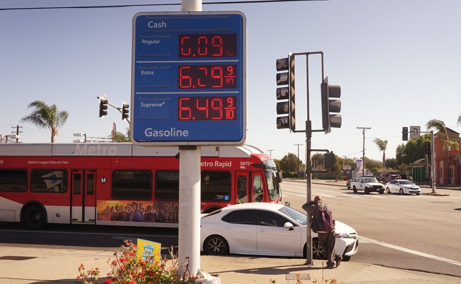 Gas prices are displayed at a gas station in Los Angeles County, California, the United States, on March 20, 2022. (Photo by Zeng Hui/Xinhua)