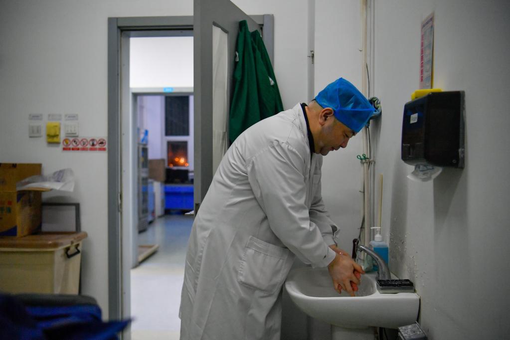 Geng Tian washes his hands at Tianjin First Hospital in north China's Tianjin, March 19, 2022. (Xinhua/Sun Fanyue)