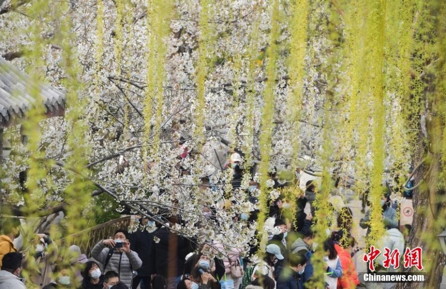 Tourists take photos of cherry blossoms Wulongtan Park of Jinan, east China's Shandong Province, March 20, 2022. Cherry blossoms have entered the blossom season across China. (Photo: China News Service/Zhang Yong)