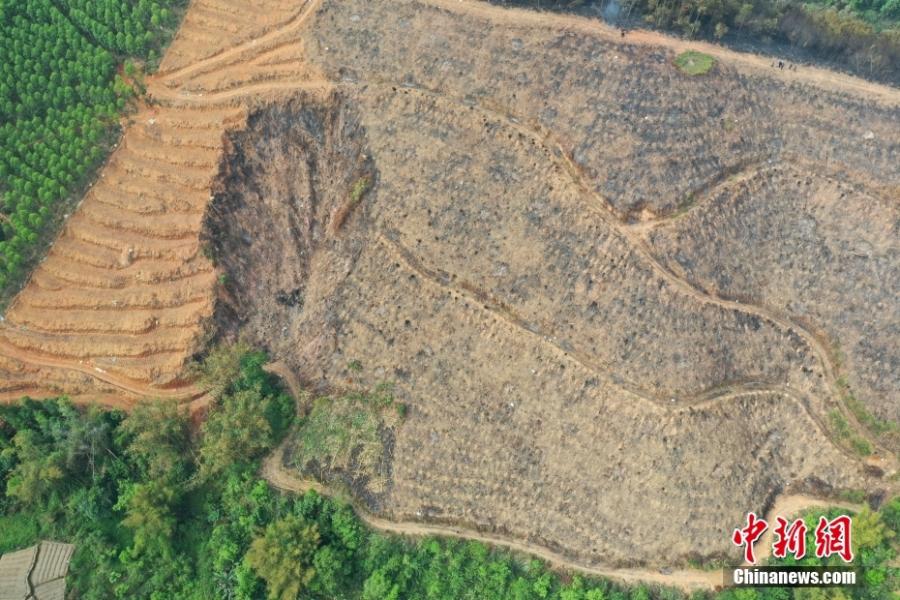 Aerial photo taken on March 22, 2022 show the crash site of a China Eastern's Boeing737 in Tengxian county, South China's Guangxi Zhuang Autonomous Region. Rescue operation work is still underway in Guangxi. (Photo: China News Service/Chen Guanyan)