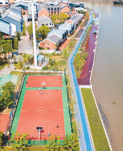 Photo shows a basketball court beside a 14-km pedestrian pathway next to a river in Baoshan district, Shanghai. (Photo/Wang Chu)