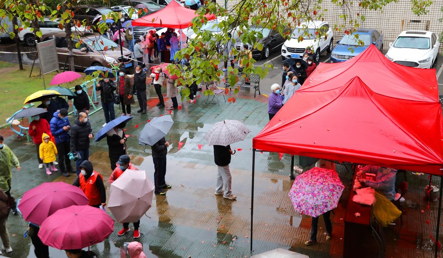 Residents queue to receive COVID-19 nucleic acid tests at a residential area in Shanghai, March 21, 2022. (Xinhua/Fang Zhe)