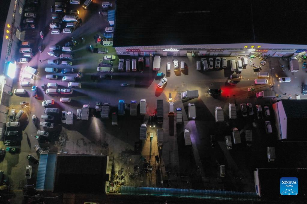 Aerial photo shows vehicles transporting vegetables to a wholesale market of agricultural products during a lockdown following the recent COVID-19 outbreak in Jilin City, northeast China's Jilin Province, March 21, 2022. (Xinhua/Zhang Nan)