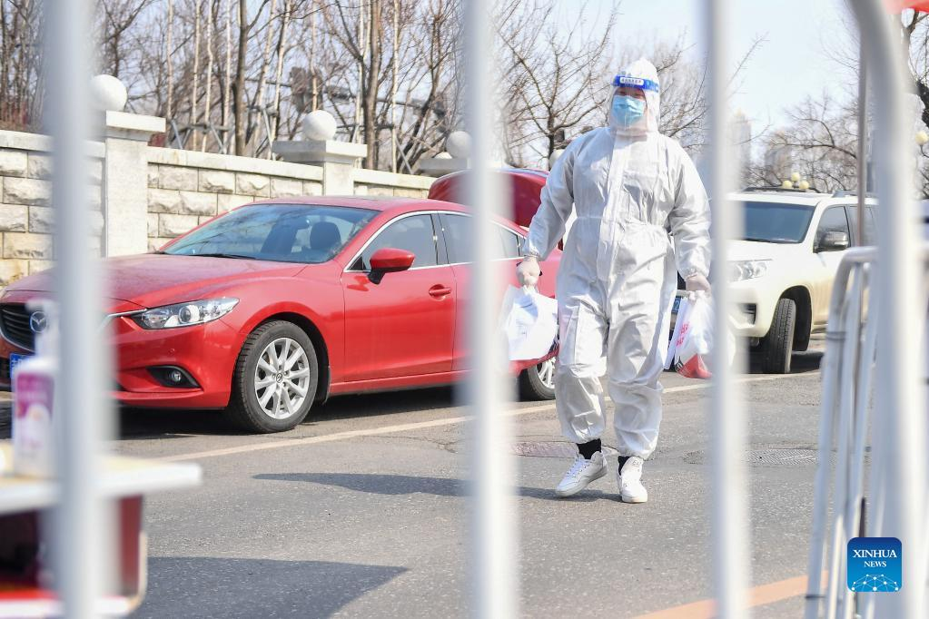 Volunteer Zhang Rui delivers residents' online orders during a lockdown following the recent COVID-19 outbreak in Jilin City, northeast China's Jilin Province, March 21, 2022. (Xinhua/Zhang Nan)