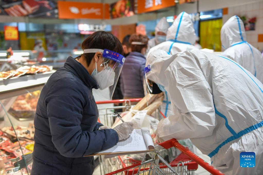 Supermarket staff members verify residents' online orders during a lockdown following the recent COVID-19 outbreak in Jilin City, northeast China's Jilin Province, March 21, 2022. (Xinhua/Zhang Nan)
