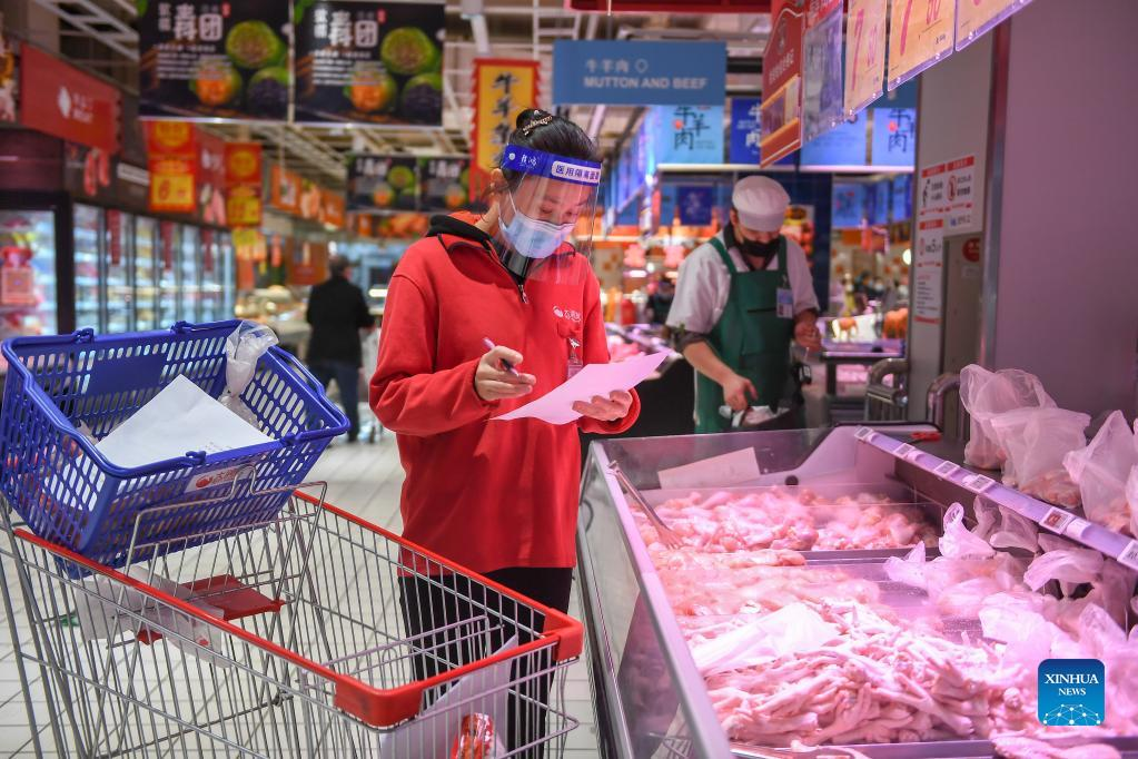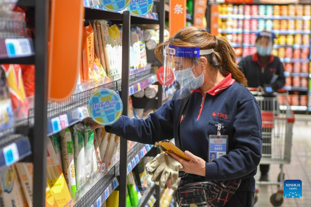 A supermarket staff member selects goods according to residents' online orders during a lockdown following the recent COVID-19 outbreak in Jilin City, northeast China's Jilin Province, March 21, 2022. (Xinhua/Zhang Nan)