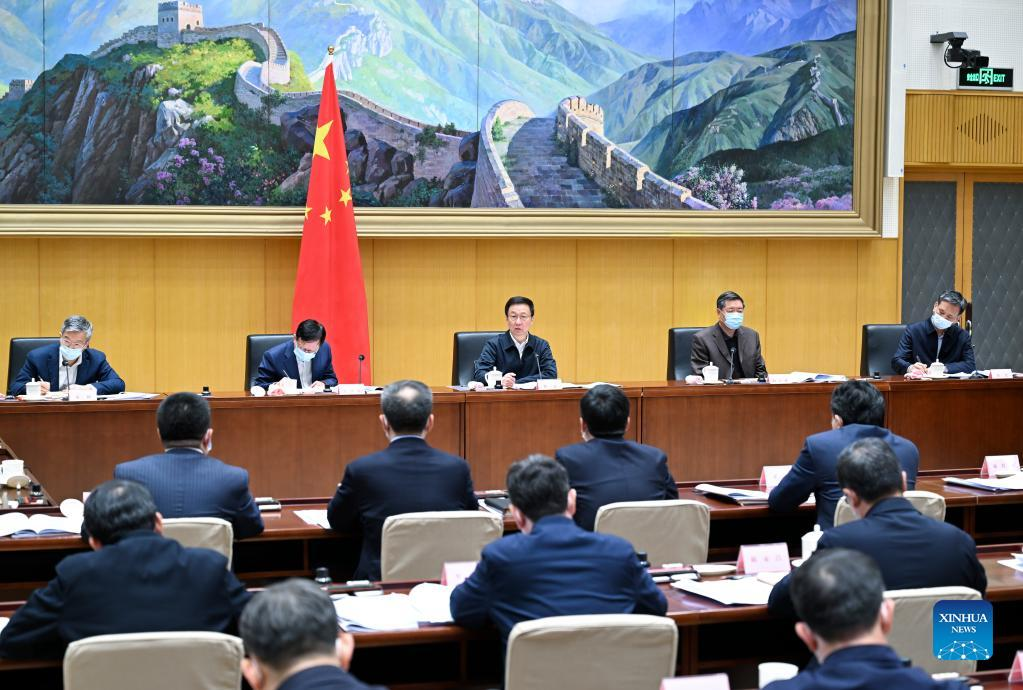 Chinese Vice Premier Han Zheng, also a member of the Standing Committee of the Political Bureau of the Communist Party of China Central Committee, presides over a meeting promoting the clean and efficient use of coal in Beijing, capital of China, March 22, 2022. (Xinhua/Zhang Ling)